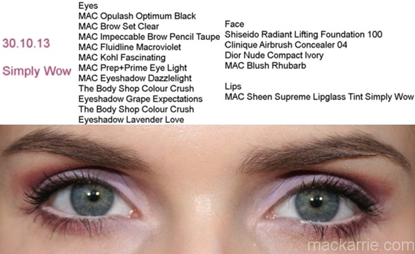 Eyes MAC Opulash Optimum Black / MAC Brow Set Clear / MAC Impeccable Brow Pencil Taupe / MAC Fluidline Macroviolet / MAC Kohl Fascinating / MAC Prep+Prime Eye Light / MAC Eyeshadow Dazzlelight / The Body Shop Colour Crush Eyeshadow Grape Expectations, Lavender Love