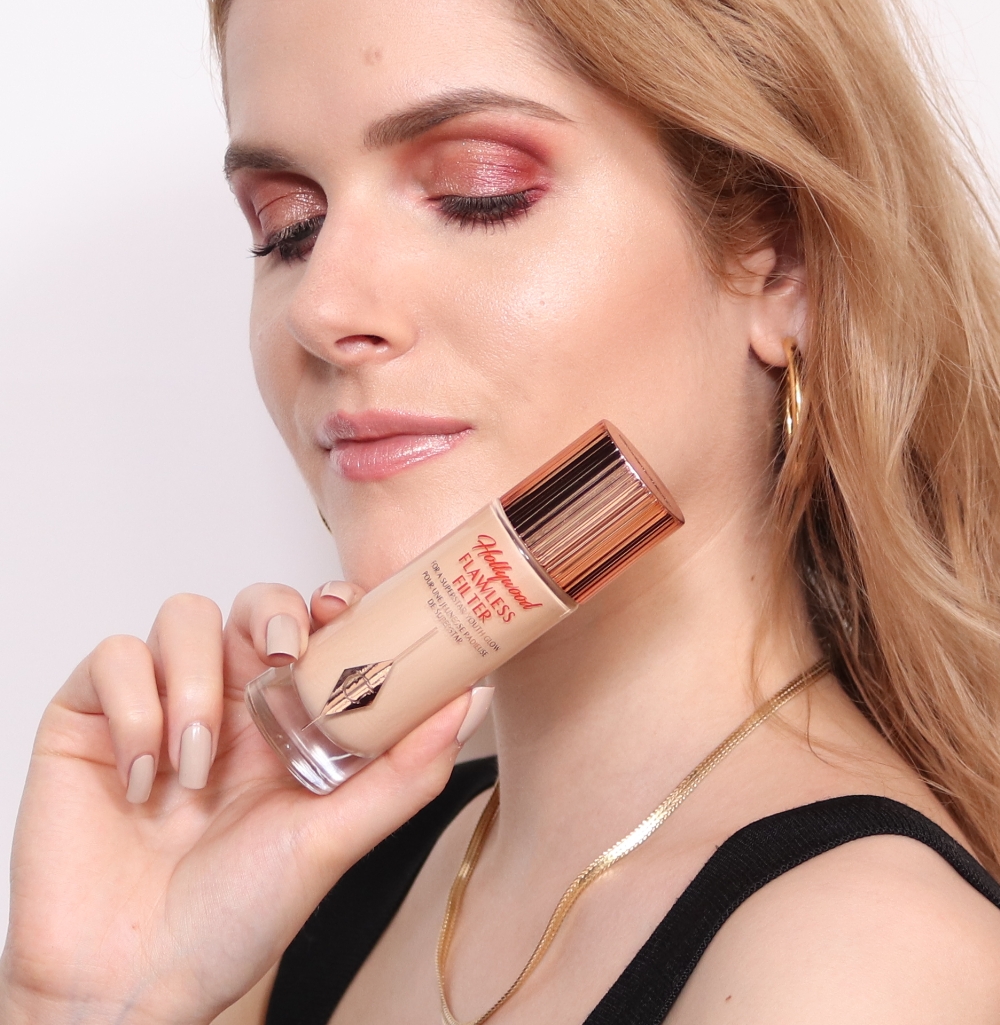 Schon ewig auf meiner Wunschliste stand der Hollywood Flawless Filter von Charlotte Tilbury, ein sehr beliebtes Produkt welches man überall sieht! Ich schleiche sicher schon seit einigen Jahren darum herum, wollte vorher aber gerne andere Produkte aufbrauchen. Also das übliche “Problem” wenn man schon viel Make-Up hat. Das Ergebnis mit dem Flawless Filter ist wie erwartet super! Die Haut wirkt so als würde sie von innen heraus strahlen, aber ohne einen sichtbaren Glitzer oder Schimmer. Ich würde das Ergebnis daher als natürlich-glowy bezeichnen. Optisch sieht der Flawless Filter auf den ersten Blick aus wie eine Foundation, die Verpackung ist eine schwere Glasflasche mit einem Applikator zum Auftragen. Am besten trifft der Vergleich mit einem “schimmernden” Primer zu, der Flawless Filter ist hautfarben und hat eine sheere Deckkraft mit einem feuchten Glow. Er kann unter dem Make-Up verwendet werden, um einen strahlenden Teint zu verleihen oder gezielt auf den gewünschten Stellen wie Wangenknochen & Co. Man kann den Flawless Filter daher auch als natürliches Highlight einsetzen, wenn man keine glitzernden oder schimmernden Produkte mag. Oder mit dem Make-Up mischen, kann total universell verwendet werden, immer dann wenn mehr Ausstrahlung erwünscht ist. Egal ob als Primer unter der Foundation, gemischt mit anderen Teint-Produkten, gezielt als Highlight aufgetupft oder sogar nur solo mit etwas Concealer, sorgt immer für diesen besonderen Hollywood Glow für den Tilbury so bekannt ist! Ein fahler Teint hat damit keine Chance. Die Konsistenz ist schön leicht und feuchtigkeitsspendend, also angenehm auf der Haut zu tragen.