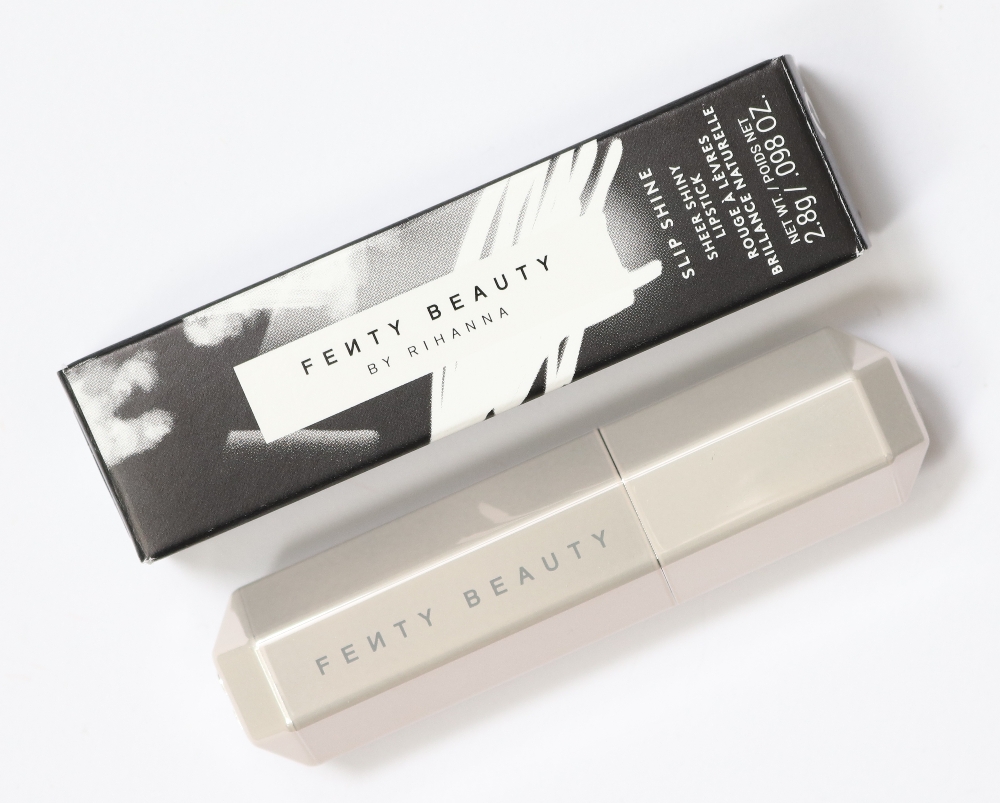 Der neue FENTY BEAUTY Slip Shine Sheer Shiny Lipstick hat eine transparente, glossy Textur und ist daher perfekt für frische Sommerlooks geeignet. Nach dem Trend der matten Lippenstifte, ist das eine gelungene Abwechslung. Sie haben eine glänzende und pflegende Textur, sind daher auch im Alltag angenehm zu tragen ohne auszutrocknen. Trotzdem nutzen sie sich nicht unschön ab oder verschmieren, die Farben veblassen lediglich beim Tragen. Da es sich um eine feuchte Konsistenz handelt, muss man den Lippenstift natürlich ab und zu auffrischen.