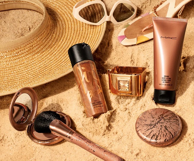 "Die neue Bronzing-Kollektion mit einer limitierten Auswahl an heißen Farbtönen für Augen, Lippen, Gesicht und Körper. Foiled Shadows kehren in frischen, versunkenen Farbtönen zurück, während die brandneuen Strobe Face Glaze den intensivsten, verführerischsten Glanz aller Zeiten liefern. Die limitierte Kollektion hat ein exklusives Metallic-Bronze-Packaging mit sommerlichem Wassertropfen-Design." - Maccosmetics